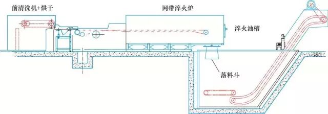 零件进淬火炉之前应设有清洗工序,以将零件表面机加工残留的切削油、切削液、防锈剂或防锈油等液体残留物清洗干净,防止加热时经高温反应形成黑斑附着在零件表面,导致淬火时无法去除,影响淬火后表面光亮性;同时,良好的前清洗工艺还能将零件上附着的灰尘和污物等洗去,防止其在高温下烧结,更牢固地附着在零件上,或淬火时落入淬火油中污染淬火油从而影响表面光亮性。